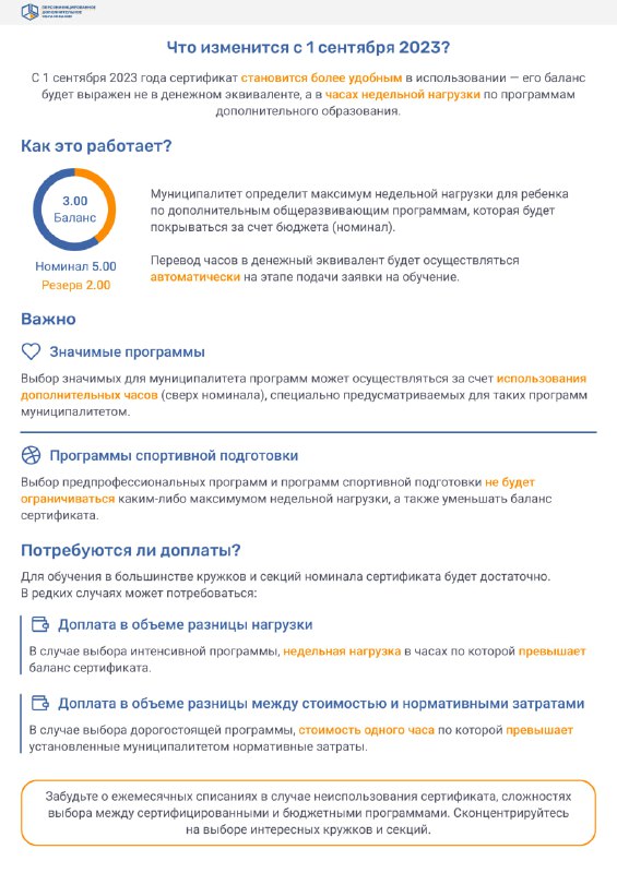 Сертификат персонифицированного финансирования – денежный сертификат, которым можно будет расплачиваться за услуги дополнительного образования. Средства на сертификате будут пополняться ежегодно. В зависимости от стоимости программы, сертификат можно будет направить на обучение по одной или нескольким программам.