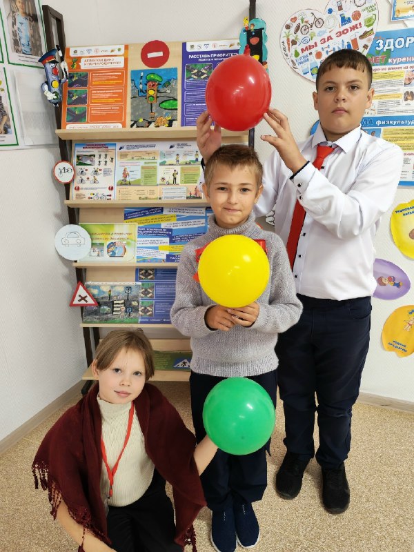 Ребята пришли в одежде красного, жёлтого и зелёного цветов, напоминая нам о важности соблюдения правил на дороге!