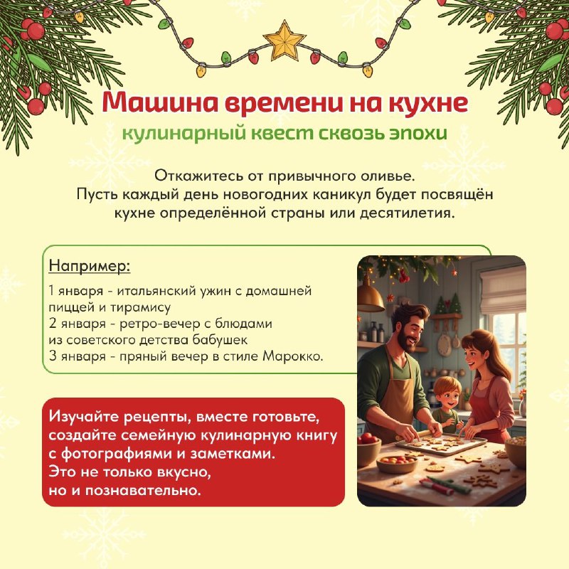 Новогодние каникулы — это целая неделя и даже больше, которую можно превратить в маленькое приключение для всей семьи. Необязательно строить грандиозные планы, главное — провести это время вместе с радостью и пользой.