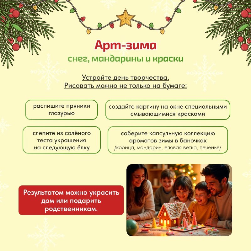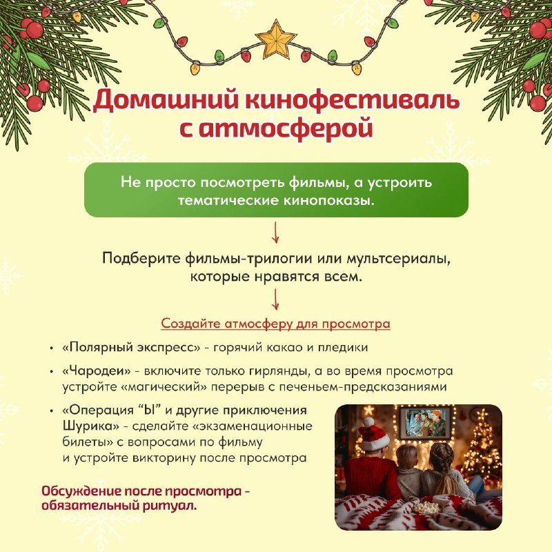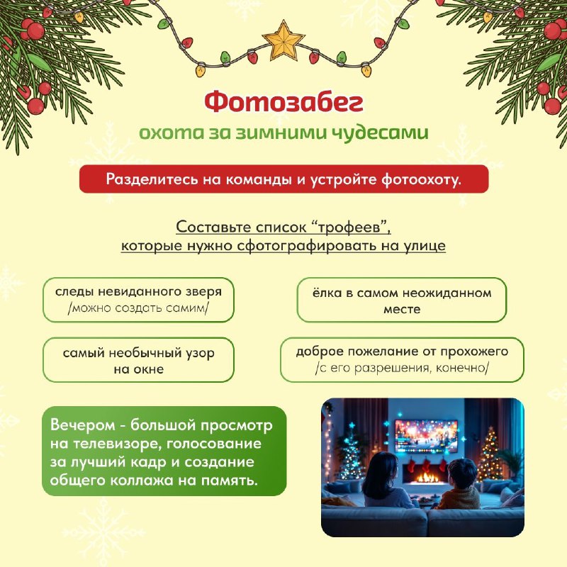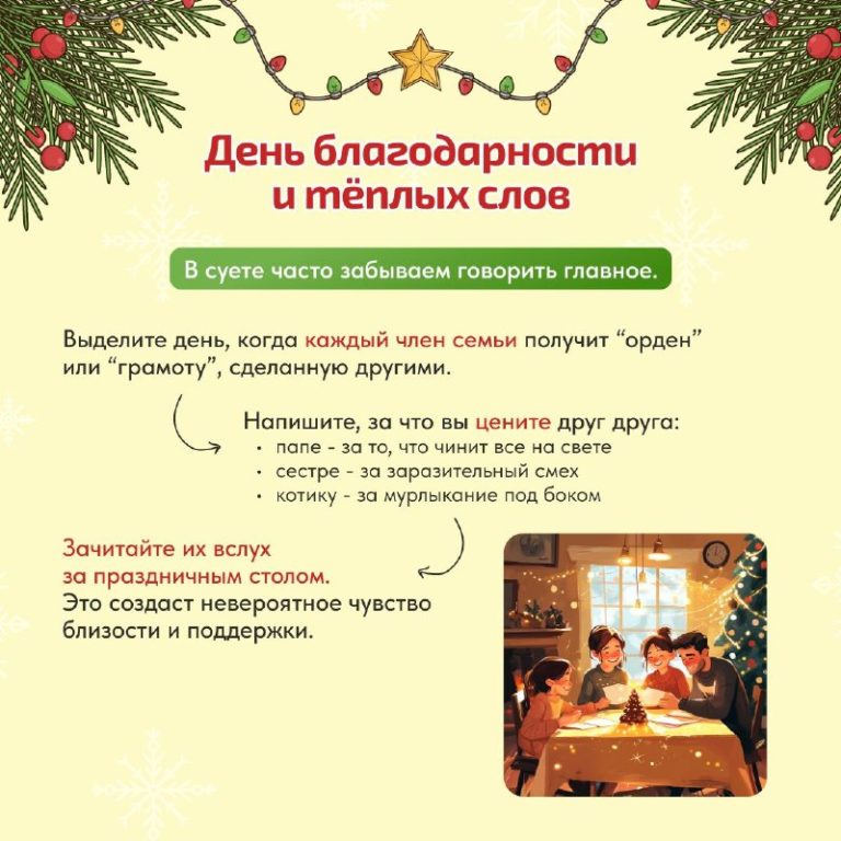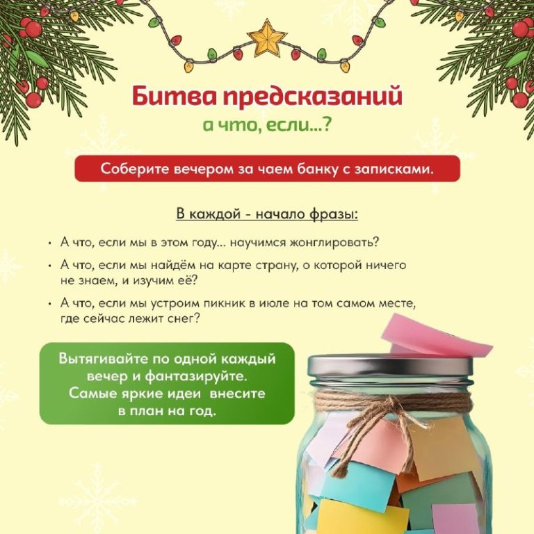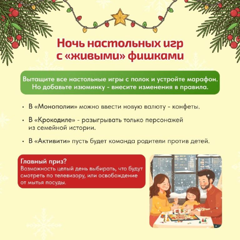 Мы собрали для вас идеи на каждый день — от активных занятий до самых уютных домашних традиций. Эти карточки помогут легко составить свой уникальный маршрут праздников.