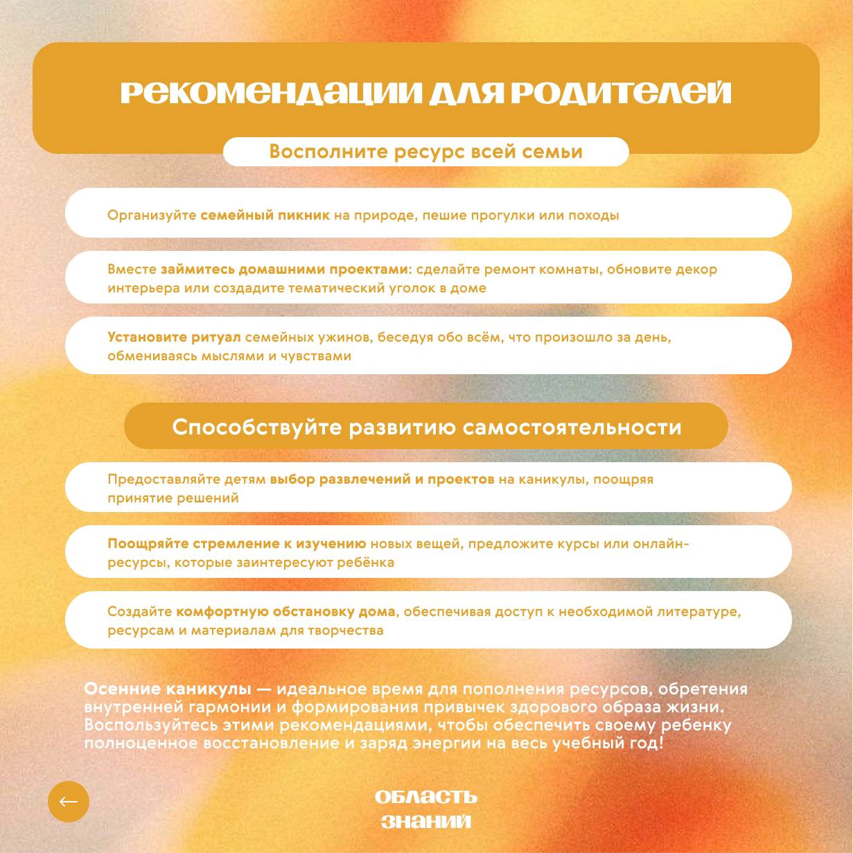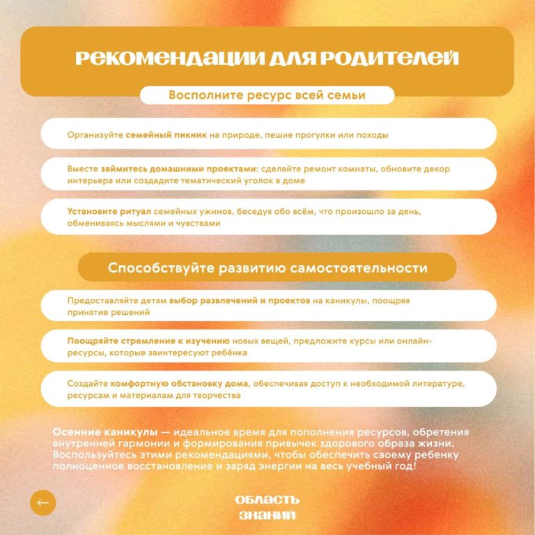 Это прекрасная возможность не просто отдохнуть от уроков, а по-настоящему перезагрузиться, восполнить силы и ресурсы, потраченные на старте учебного марафона. Специалисты Центра психолого-педагогической, медицинской и социальной помощи подготовили для вас, дорогие родители и дети, ценные рекомендации.