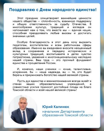 С Днем народного единства! rooalex04.11.202505.11.2025Мероприятия, Новости Поздравление начальника Департамента образования Томской области Юрия Калинюка с Днем народного единства!